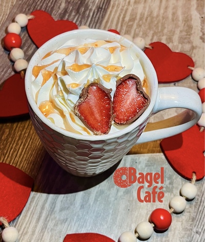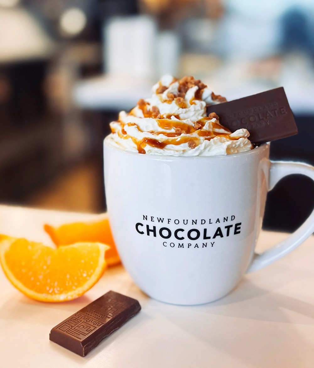 Creamy milk chocolate with orange infusion topped with vanilla whipped cream drizzled with our butterscotch caramel and sprinkled with our toffee bites.